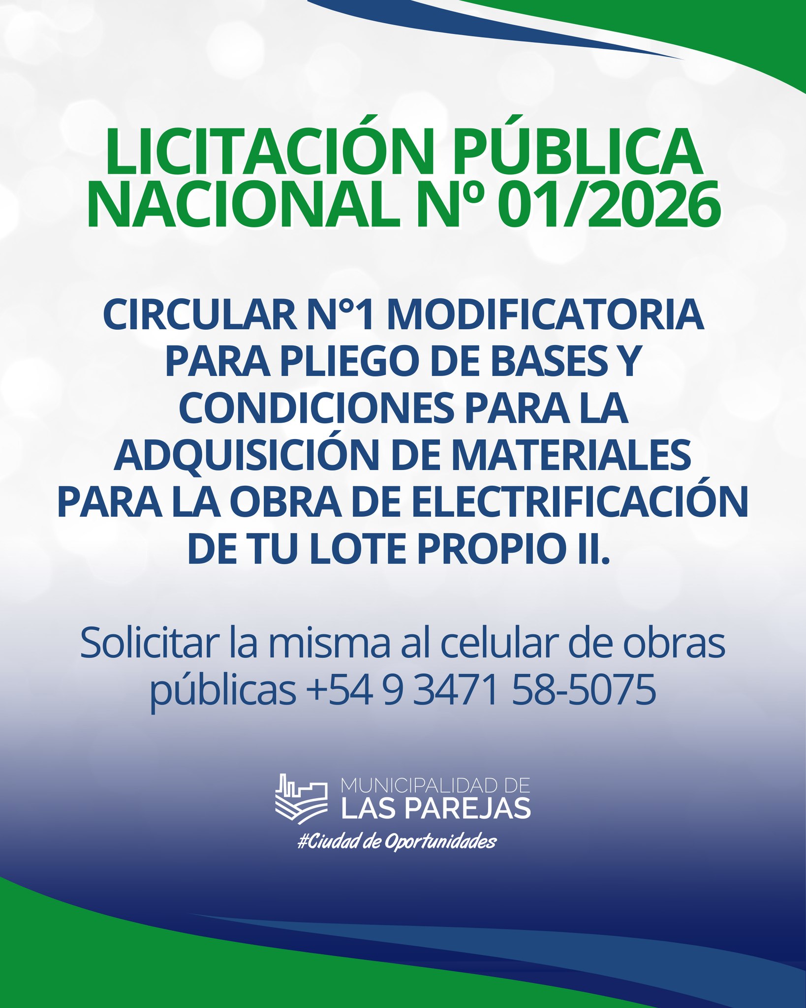 Continuar LeyendoCIRCULAR N1 MODIFICATORIA PARA PLIEGO DE BASES Y CONDICIONES PARA LA ADQUISICIÓN DE MATERIALES PARA LA OBRA DE ELECTRIFICACIÓN DE TU LOTE PROPIO II. Solicitar la misma al celular de obras públicas 3471 585075.